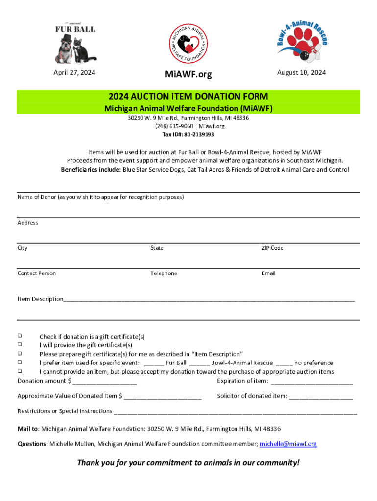 April 27, 2024August 10, 2024MiAWF.org 2024 AUCTION ITEM DONATION FORM Michigan Animal Welfare Foundation (MiAWF) 30250 W. 9 Mile Rd., Farmington Hills, MI 48336 (248) 6159060 | Miawf.org Tax ID#: