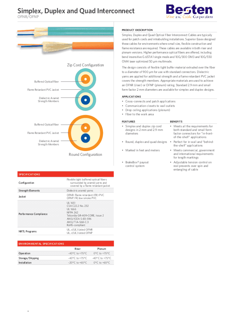 TABLE OF CONTENTSSimplex, Duplex and Quad Interconnect OFNR/OFNPProduct DescriptionPREMISES CABLEZip Cord Configuration OSP CABLEBuffered Optical FiberFTTPFlame Retardant PVC JacketSimplex, Duplex