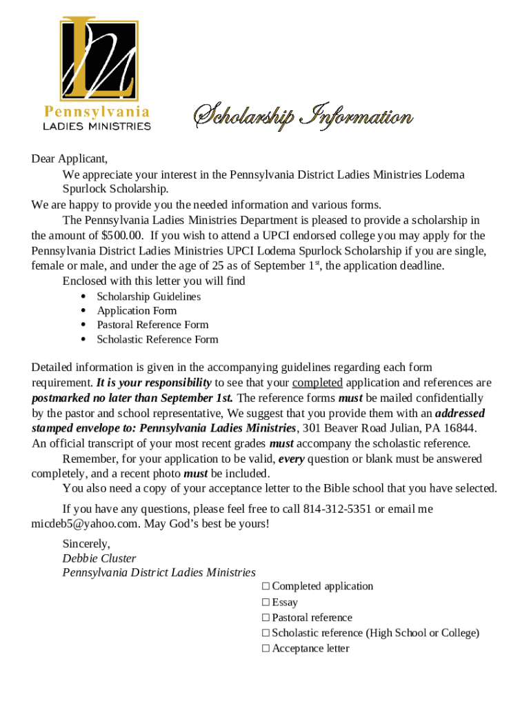 Template Lodema Spurlock Bible School Scholarship Application instructions