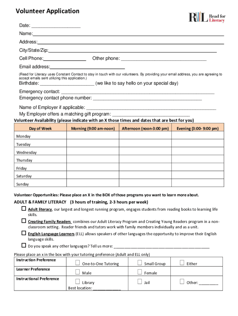 Volunteer Application Date: ___ Name: Address: City/State/Zip: Cell Phone:Other phone: ___Email address: (Read for Literacy uses Constant Contact to stay in touch with our volunteers. By providing