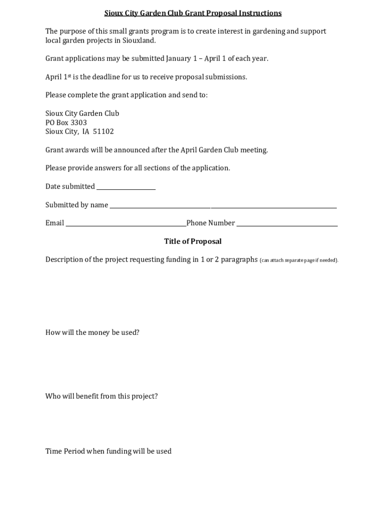 Sioux City Garden Club Grant Proposal Instructions The purpose of this small grants program is to create interest in gardening and support local garden projects in Siouxland. Grant applications may