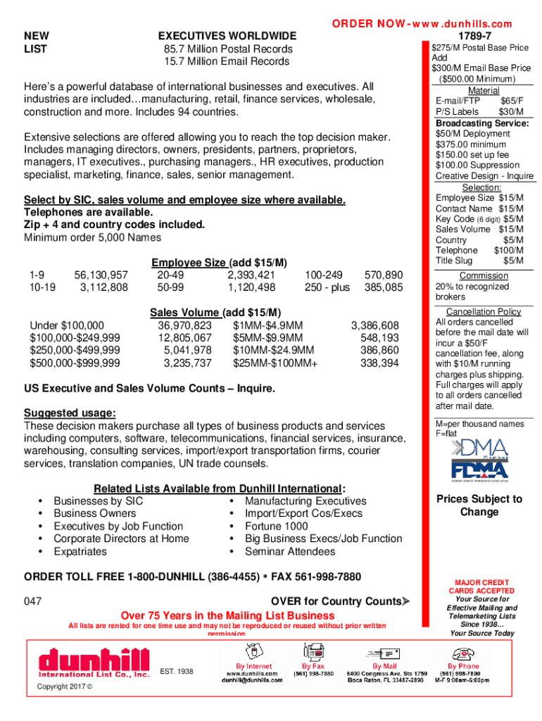 15.7 Million Email Records$275/M Postal Base Procedures a powerful database of international businesses and executives.