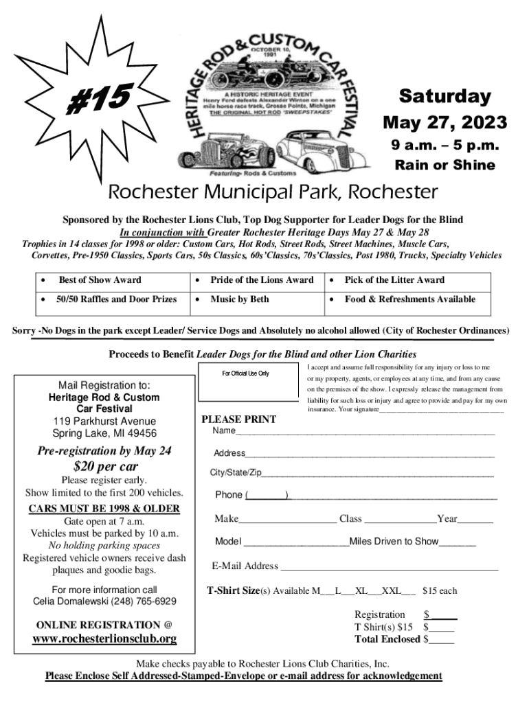Saturday May 27, 2023 9 a.m. 5 p.m. Rain or ShineRochester Municipal Park, Rochester Michigan Sponsored by the Rochester Lions Club, Top Dog Supporter for Leader Dogs for the Blind In conjunction