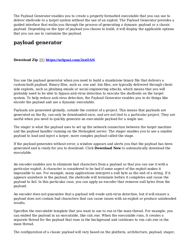The Payload Generator enables you to create a properly formatted executable that you can use to deliver shellcode to a target system without the use of an exploit. The Payload Generator provides a