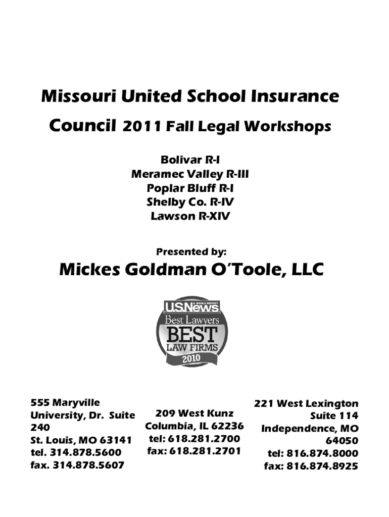 Missouri United School Insurance Council 2011 Fall Legal Workshops Bolivar RI Meramec Valley RIII Poplar Bluff RI Shelby Co. RIV Lawson RXIV Presented by:Mickes Goldman OToole, LLC555 Maryville 221
