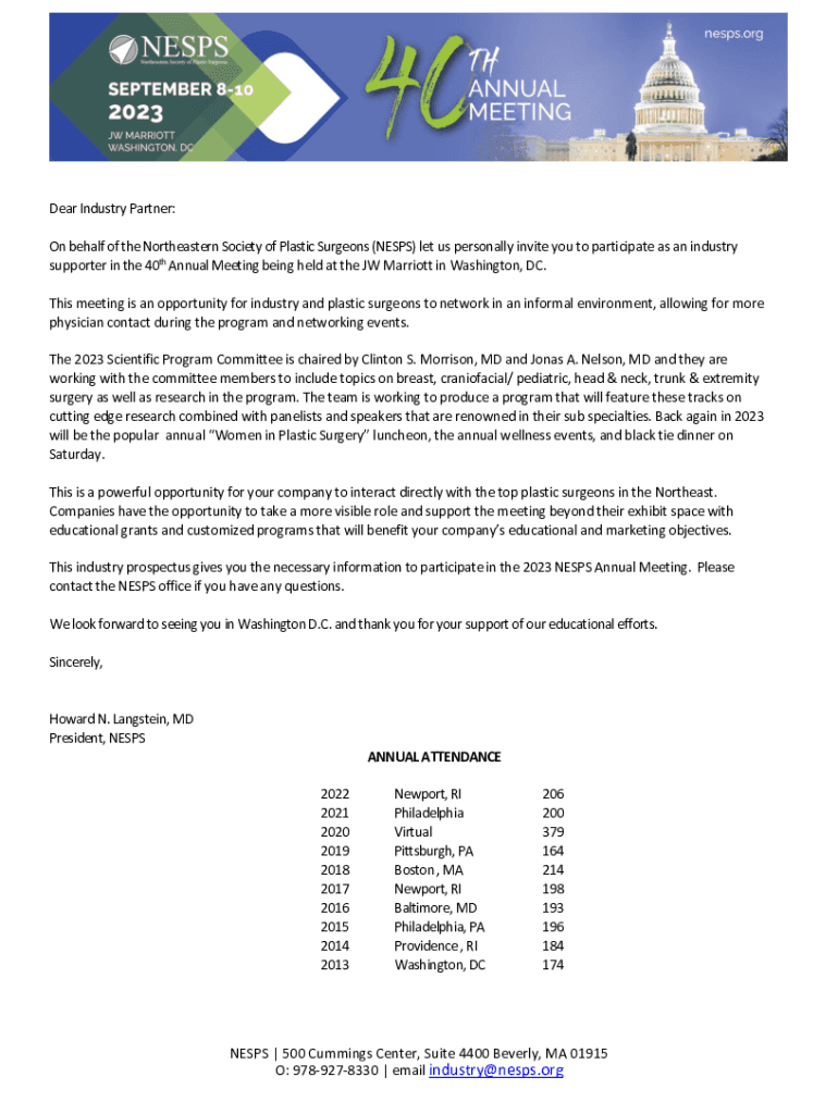 Dear Industry Partner: On behalf of the Northeastern Society of Plastic Surgeons (NESPS) let us personally invite you to participate as an industry supporter in the 40th Annual Meeting being held