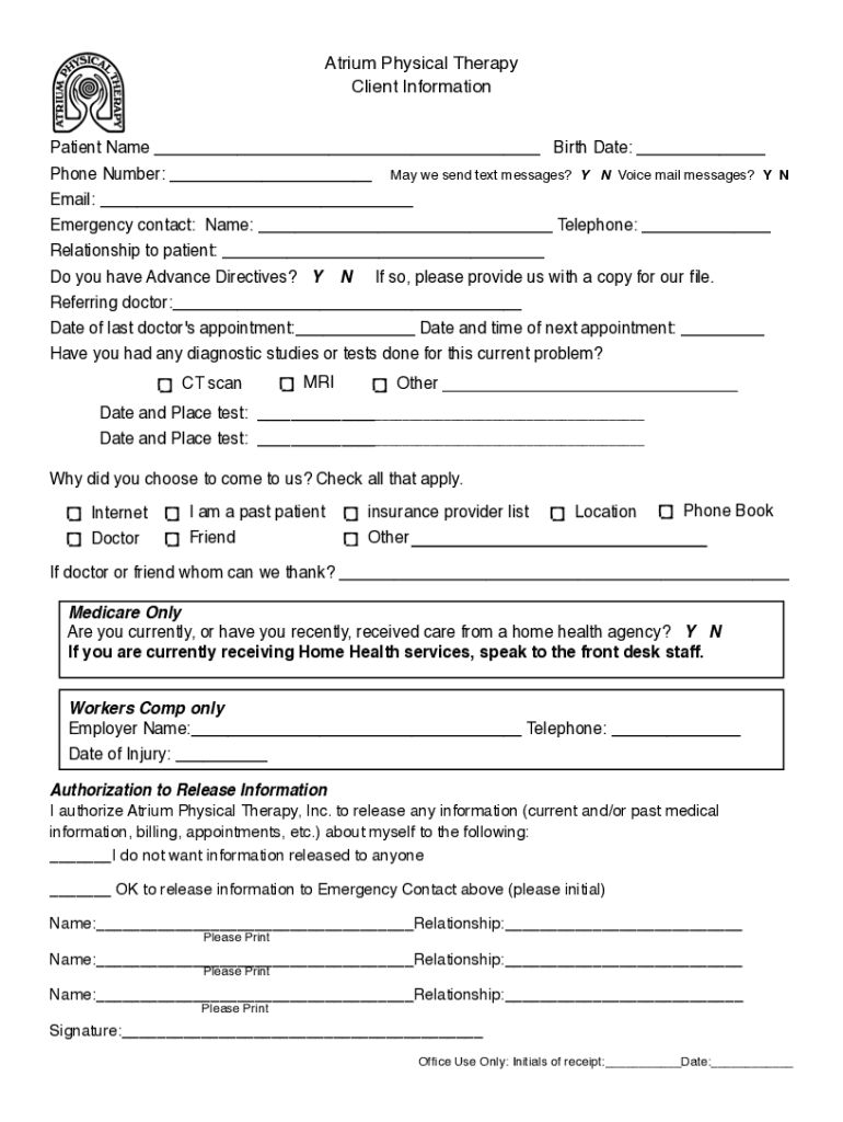 Atrium Physical Therapy Client Information Patient Name ___ Birth Date: ___ Phone Number: ___May we send text messages? Y N Voice mail messages? Y NEmail: ___ Emergency contact: Name: ___ Telephone: