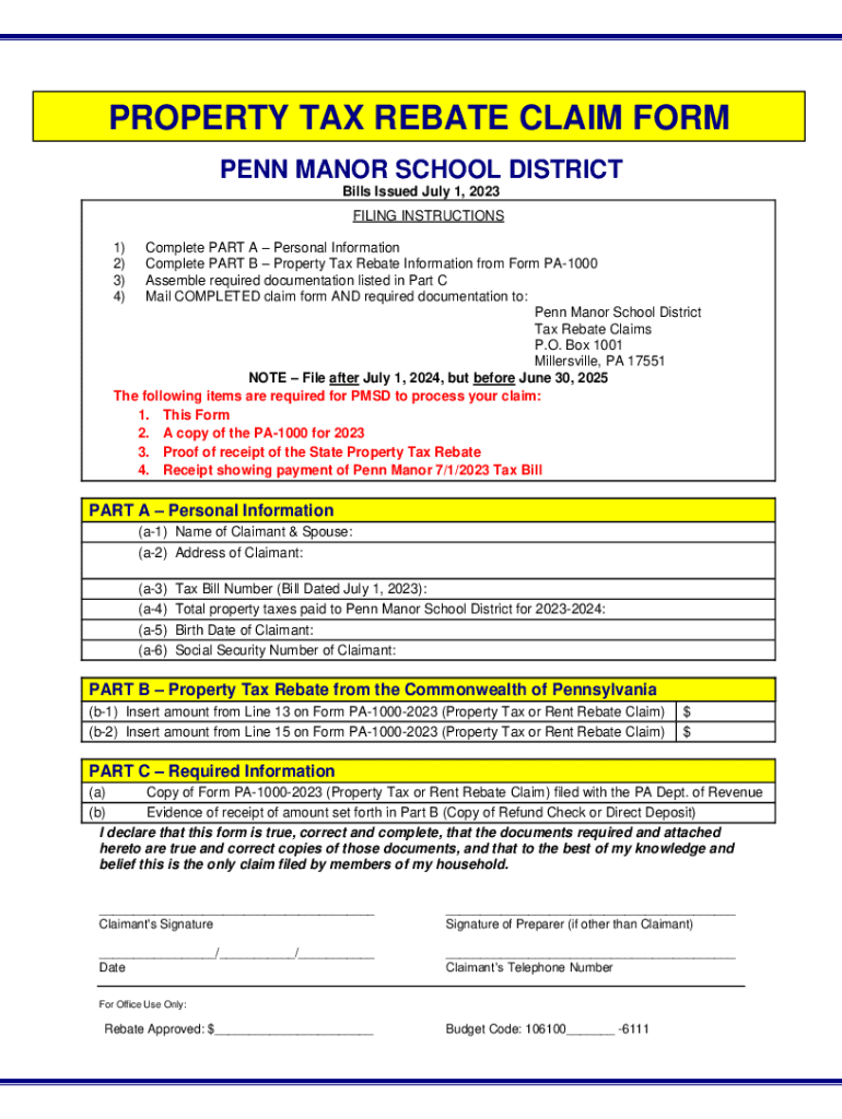 PROPERTY TAX REBATE CLAIM FORM PENN MANOR SCHOOL DISTRICT Bills Issued July 1, 2023 FILING INSTRUCTIONS Complete PART A Personal Information Complete PART B Property Tax Rebate Information from Form