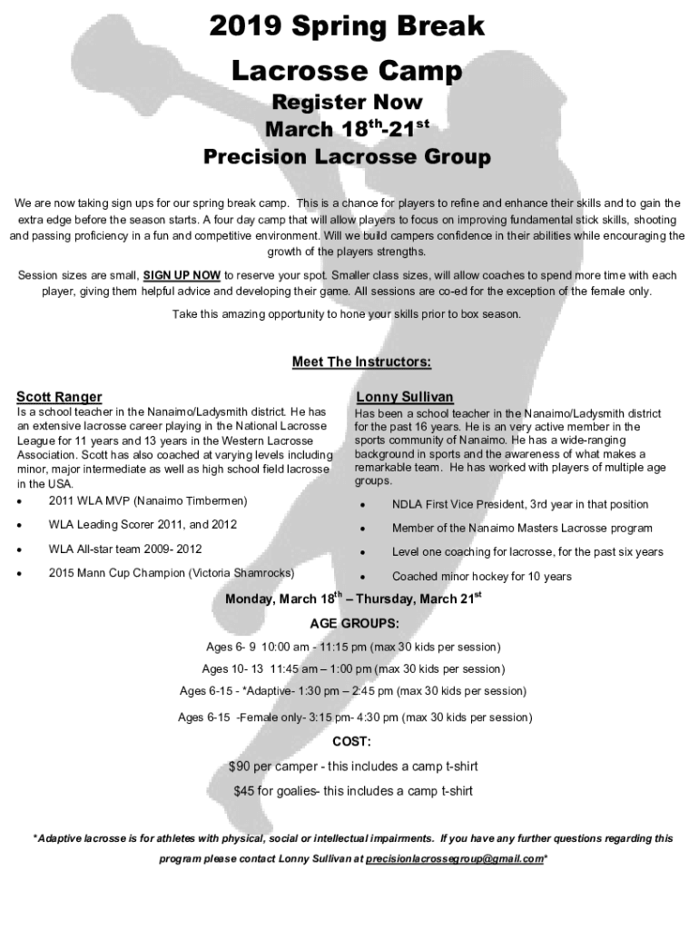 2019 Spring Break Lacrosse CampRegister Now March 18th21st Precision Lacrosse Group We are now taking sign ups for our spring break camp. This is a chance for players to refine and enhance their skills
