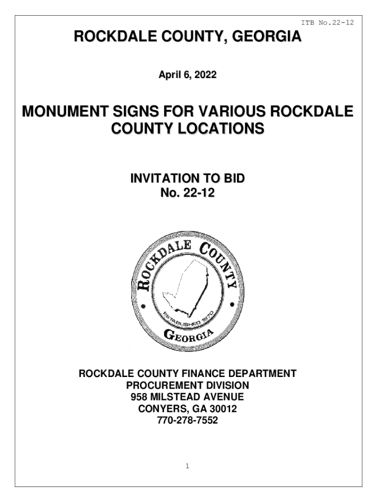 ITB No.2212ROCKDALE COUNTY, GEORGIA April 6, 2022MONUMENT SIGNS FOR VARIOUS ROCKDALE COUNTY LOCATIONS INVITATION TO BID No. 2212ROCKDALE COUNTY FINANCE DEPARTMENT PROCUREMENT DIVISION 958 MILSTEAD