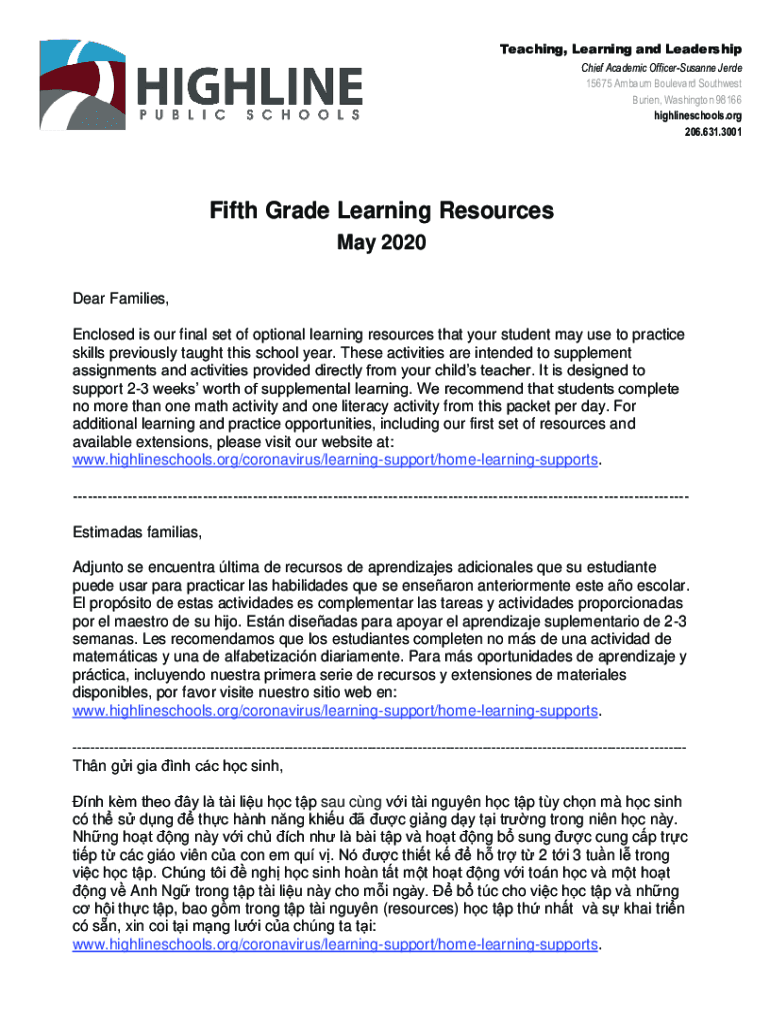Teaching, Learning and Leadership Chief Academic OfficerSusanne Jerde 15675 Ambaum Boulevard Southwest Burien, Washington 98166 highlineschools.org 206.631.3001Fifth Grade Learning Resources May 2020