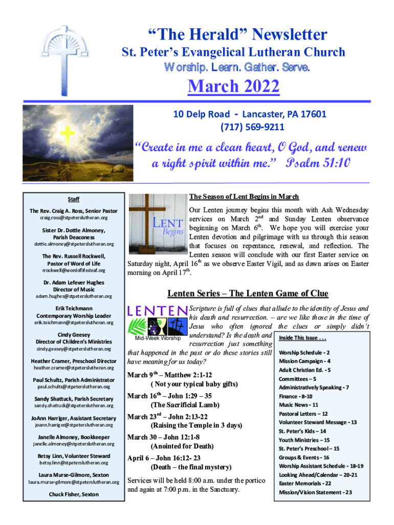 The Herald Newsletter St. Peters Evangelical Lutheran Church Worship. Learn. Gather. Serve.March 2022 10 Delp Road Lancaster, PA 17601 (717) 5699211Create in me a clean heart, O God, and renew a right
