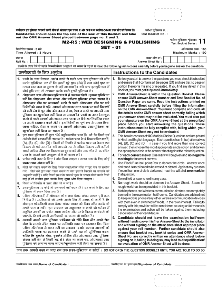 U S U U cu 2 U 3 S OMR U Candidates should open the top side of the seal of this Booklet and take out the OMR Answer Sheet placed between page no. 2 and 3. S. Test Booklet No. M2R5 : WEB DESIGNING
