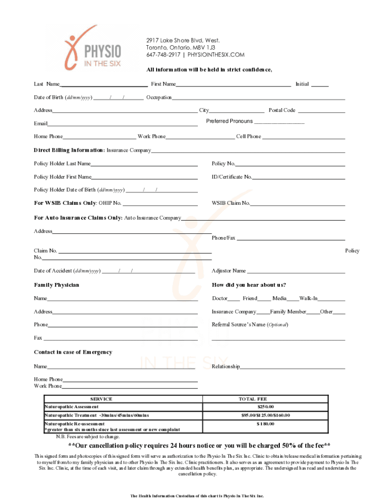 2917 Lake Shore Blvd, West. Toronto, Ontario. M8V 1J3 6477482917 | PHYSIOINTHESIX.COMAll information will be held in strict confidence, Last Name ___ First Name Date of Birth (dd/mm/yyyy)//InitialOccupationAddressCityPostal