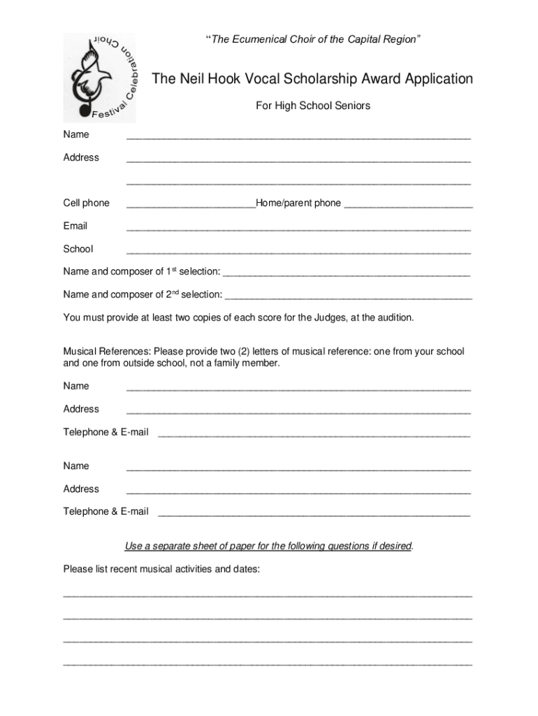The Ecumenical Choir of the Capital RegionThe Neil Hook Vocal Scholarship Award Application For High School Seniors Name___Address___ ___Cell phone___Home/parent phone ___Email___School___Name and