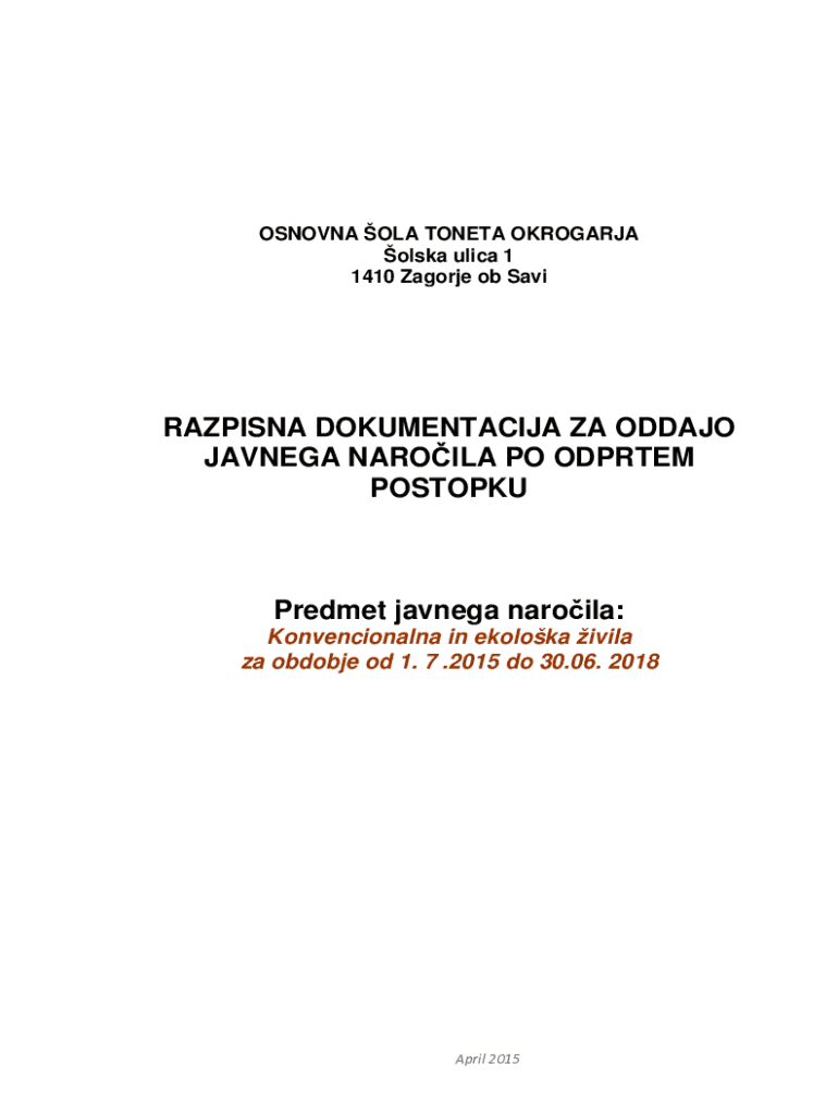 OSNOVNA OLA TONETA OKROGARJA olska ulica 1 1410 Zagorje ob SaviRAZPISNA DOKUMENTACIJA ZA ODDAJO JAVNEGA NAROILA PO ODPRTEM POSTOPKUPredmet javnega naroila: Konvencionalna in ekoloka ivila za obdobje