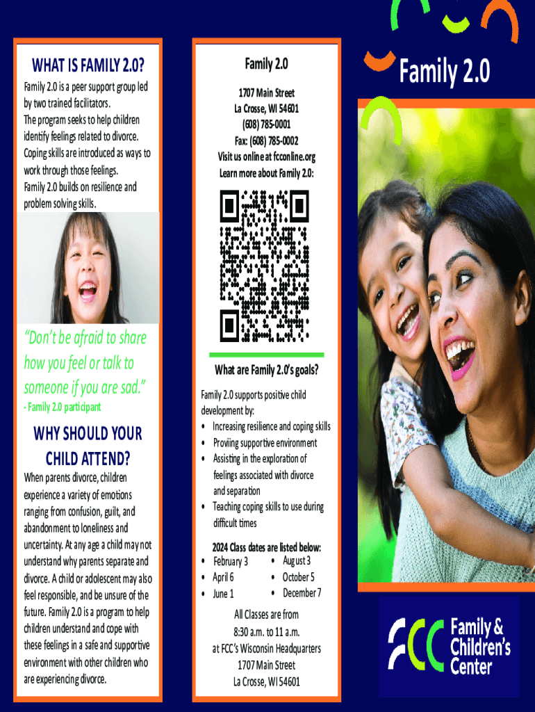 Family 2.0WHAT IS FAMILY 2.0? Family 2.0 is a peer support group led by two trained facilitators. The program seeks to help children identify feelings related to divorce. Coping skills are introduced