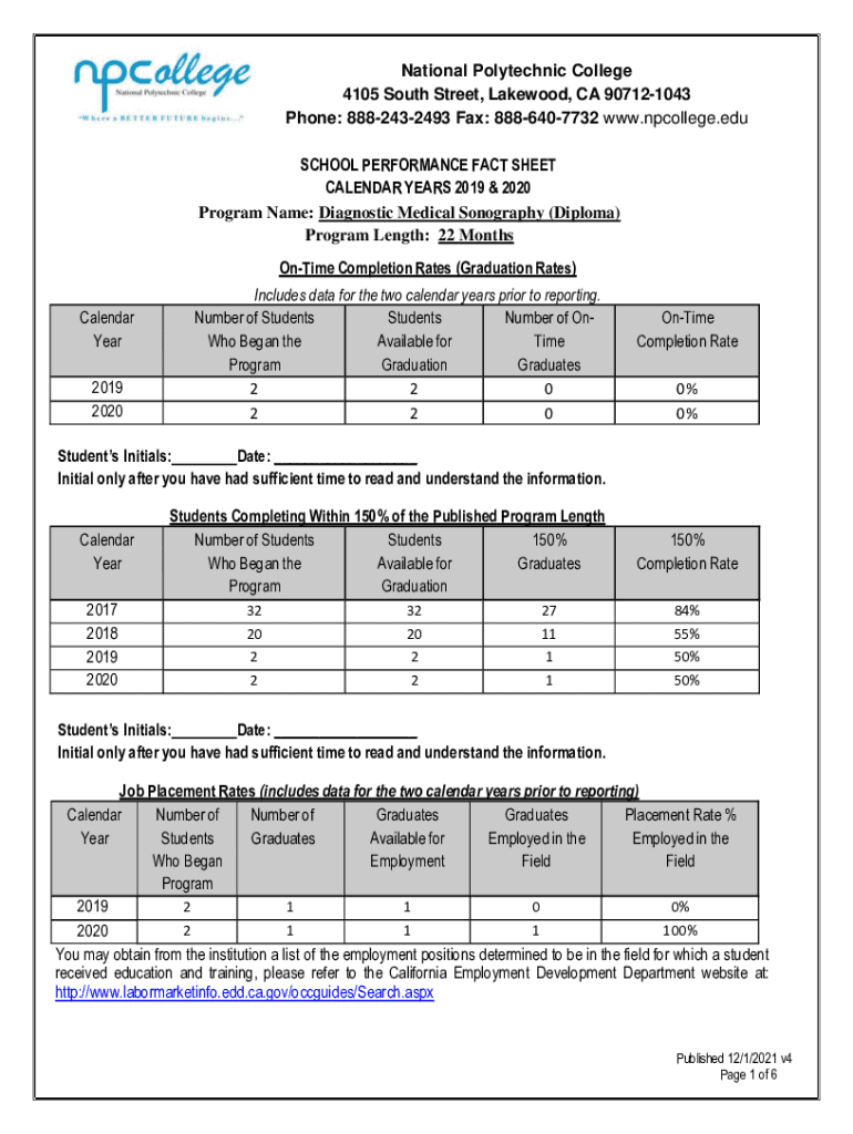 National Polytechnic College 4105 South Street, Lakewood, CA 907121043 Phone: 8882432493 Fax: 8886407732 www.npcollege.edu SCHOOL PERFORMANCE FACT SHEET CALENDAR YEARS 2019 & 2020 Program Name: Diagnostic