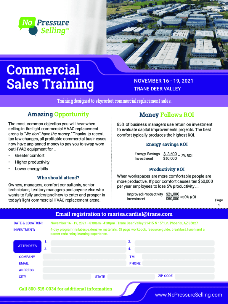 Commercial Sales TrainingNOVEMBER 16 19, 2021 TRANE DEER VALLEYTraining designed to skyrocket commercial replacement sales.Amazing OpportunityMoney Follows ROIThe most common objection you will hear