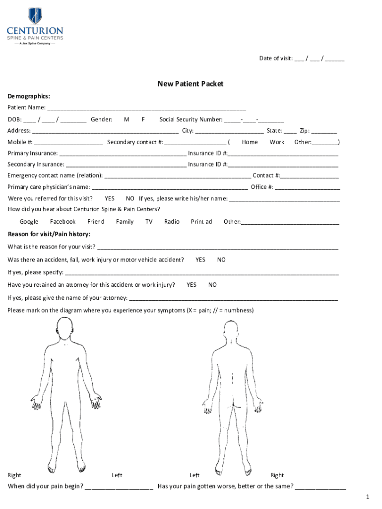 Date of visit: ___ / ___ / ___New Patient PacketDemographics:Patient Name: ___DOB: ___ / ___ / ___Gender:MFSocial Security Number: _________Address: ___City: ___State: ___Zip: ___Mobile #: ___Secondary