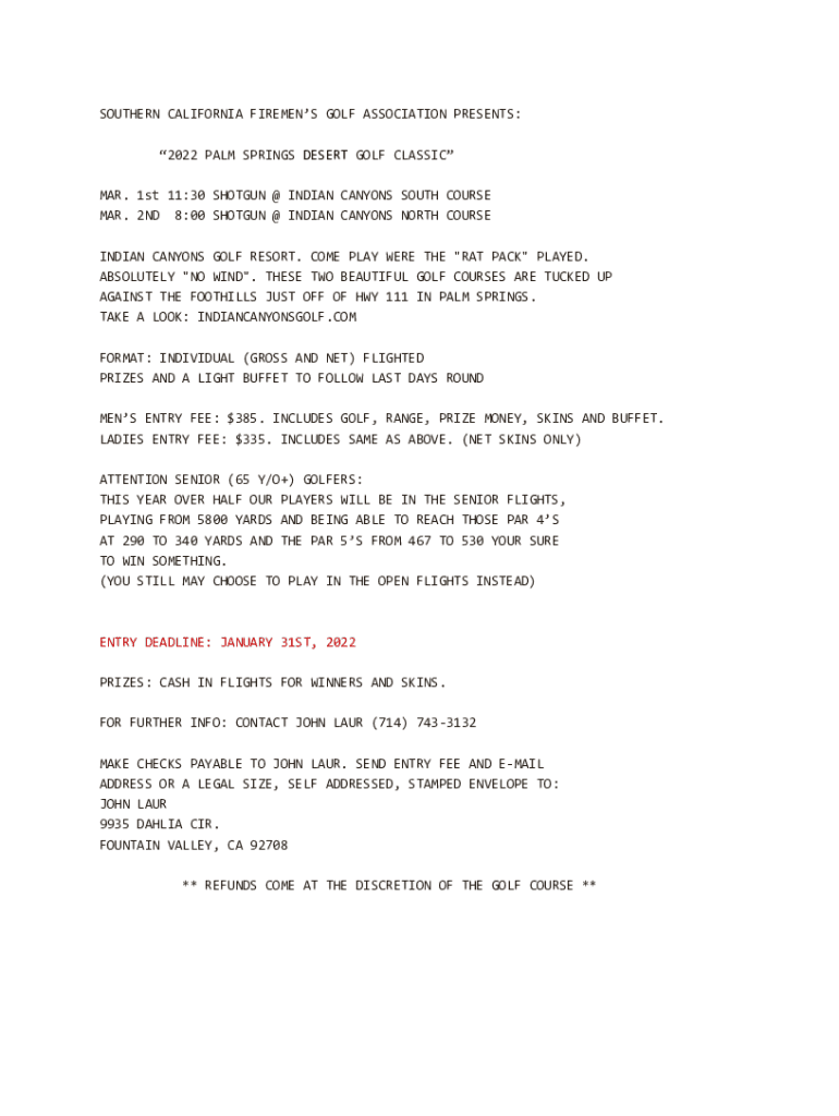 SOUTHERN CALIFORNIA FIREMENS GOLF ASSOCIATION PRESENTS: 2022 PALM SPRINGS DESERT GOLF CLASSIC MAR. 1st 11:30 SHOTGUN @ INDIAN CANYONS SOUTH COURSE MAR. 2ND 8:00 SHOTGUN @ INDIAN CANYONS NORTH COURSE