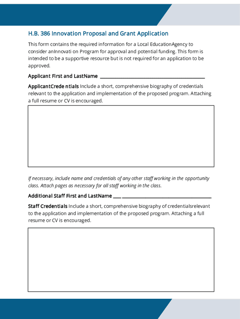H.B. 386 Innovation Proposal and Grant Application This form contains the required information for a Local Education Agency to consider an Innovation Program for approval and potential funding. This