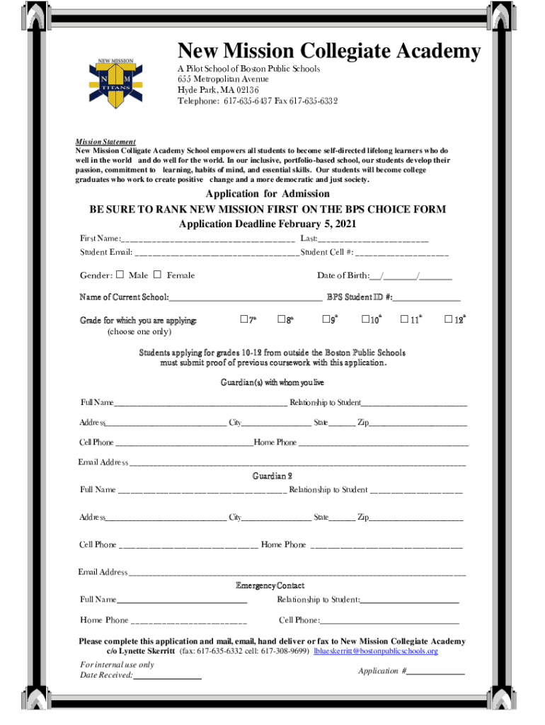 New Mission Collegiate Academy A Pilot School of Boston Public Schools 655 Metropolitan Avenue Hyde Park, MA 02136 Telephone: 6176356437 Fax 6176356332Mission Statement New Mission Colligate Academy