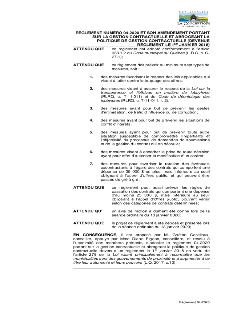 RGLEMENT NUMRO 042020 ET SON AMENDEMENT PORTANT SUR LA GESTION CONTRACTUELLE ET ABROGEANT LA POLITIQUE DE GESTION CONTRACTUELLE (DEVENUE RGLEMENT LE 1ER JANVIER 2018) ATTENDU QUE ce rglement est adopt