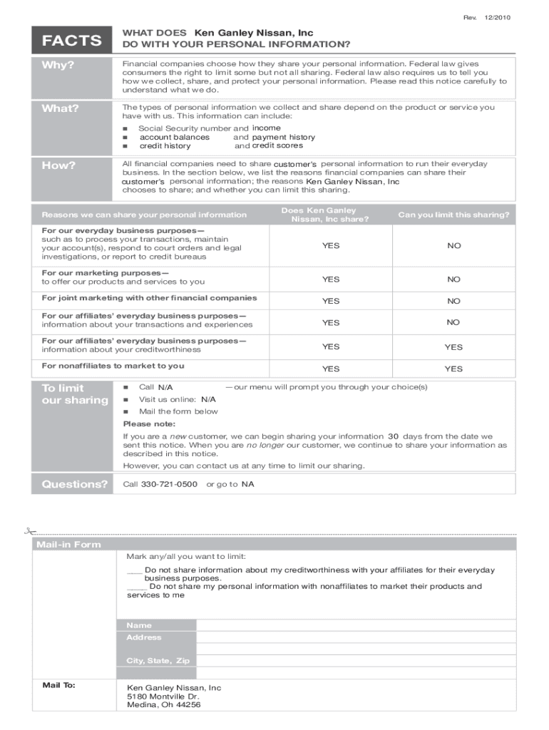 Rev.FACTS12/2010WHAT DOES Ken Ganley Nissan, Inc DO WITH YOUR PERSONAL INFORMATION?Why?Financial companies choose how they share your personal information. Federal law gives consumers the right to