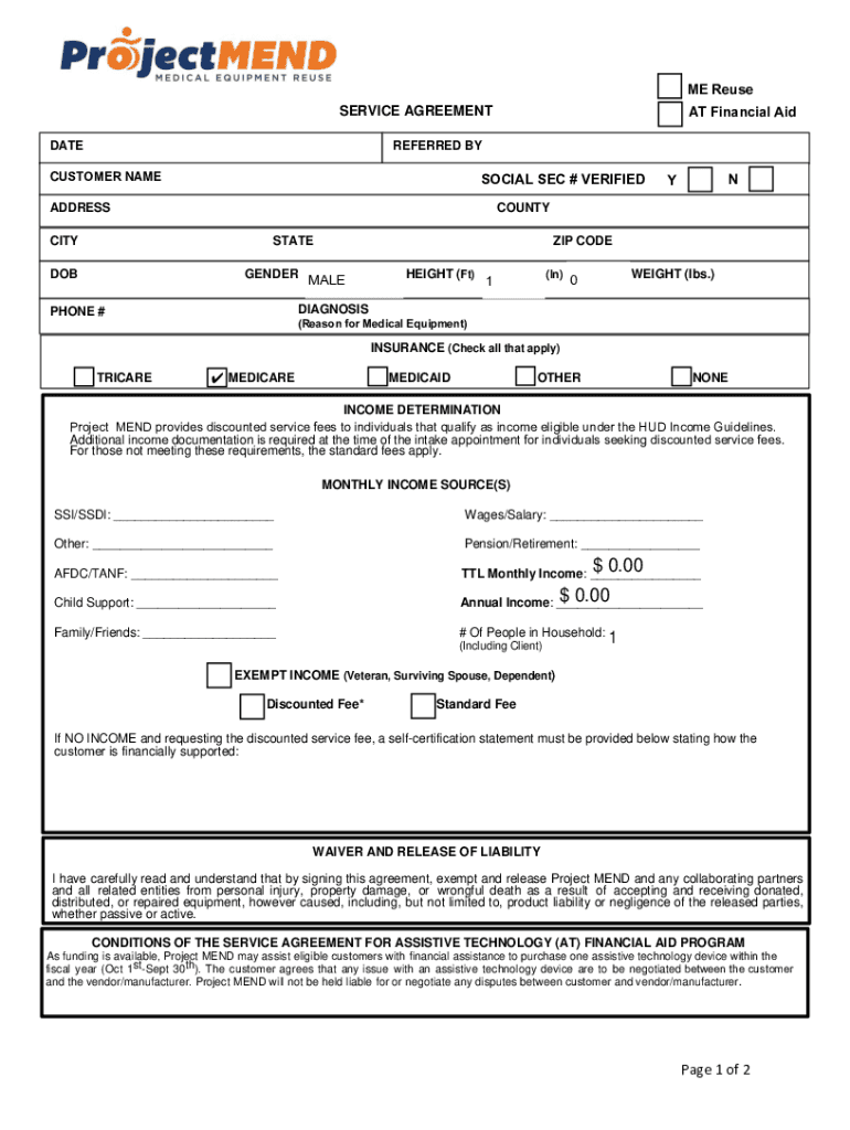 ME Reuse AT Financial AidSERVICE AGREEMENT DATEREFERRED BYSOCIAL SEC # VERIFIEDCUSTOMER NAME ADDRESSCOUNTYCITYSTATEDOBNYGENDERZIP CODEMALEHEIGHT (Ft)(In)1WEIGHT (lbs.)0DIAGNOSISPHONE #(Reason for