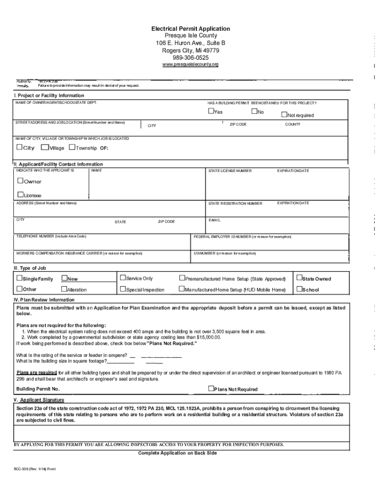 Electrical Permit ApplicationPresque Isle County 106 E. Huron Ave., Suite B Rogers City, Mi 49779 9893060525 www.presqueislecounty.orgFailure to provide information may result in denial of your request.I.