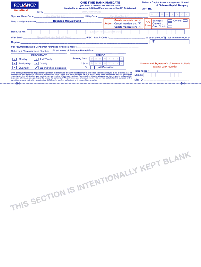 ONE TIME BANK MANDATEReliance Capital Asset Management Limited A Reliance Capital Company(NACH / ECS / Direct Debit Mandate Form) (Applicable for Lumpsum Additional Purchases as well as SIP Registration)APP