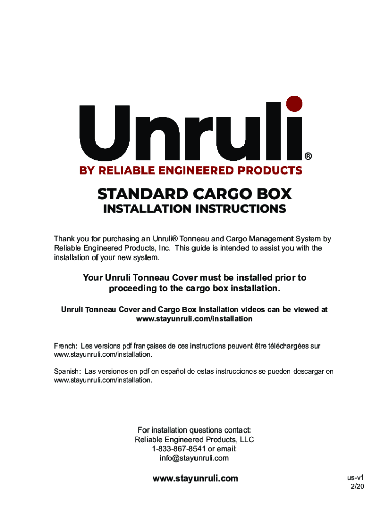 STANDARD CARGO BOX INSTALLATION INSTRUCTIONSThank you for purchasing an Unruli Tonneau and Cargo Management System by Reliable Engineered Products, Inc. This guide is intended to assist you with the
