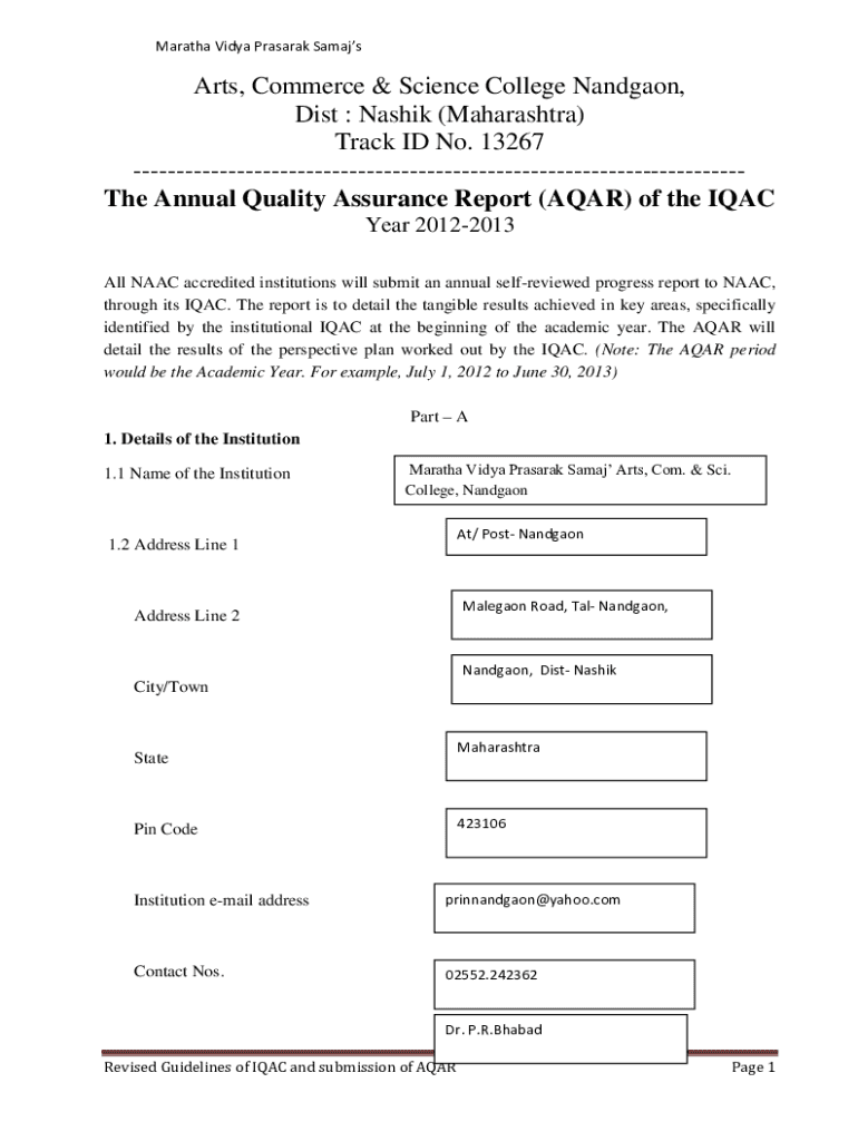 Maratha Vidya Prasarak SamajsArts, Commerce & Science College Nandgaon, Dist : Nashik (Maharashtra) Track ID No. 13267 The Annual Quality Assurance Report (AQAR) of the IQAC Year 20122013 All NAAC