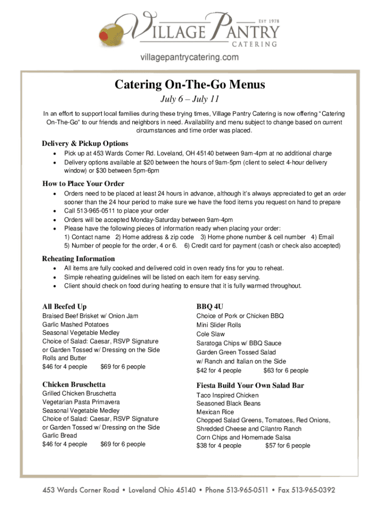 Catering OnTheGo Menus July 6 July 11 In an effort to support local families during these trying times, Village Pantry Catering is now offering Catering OnTheGo to our friends and neighbors in need.