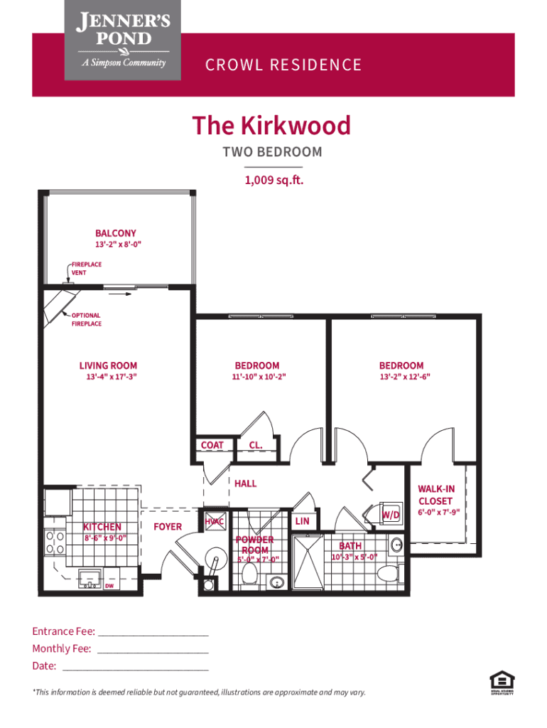 CROWL RESIDENCEThe Kirkwood TWO BEDROOM 1,009 sq.ft.Entrance Fee: ___ Monthly Fee: ___ Date: ___ *This information is deemed reliable but not guaranteed, illustrations are approximate and may vary.