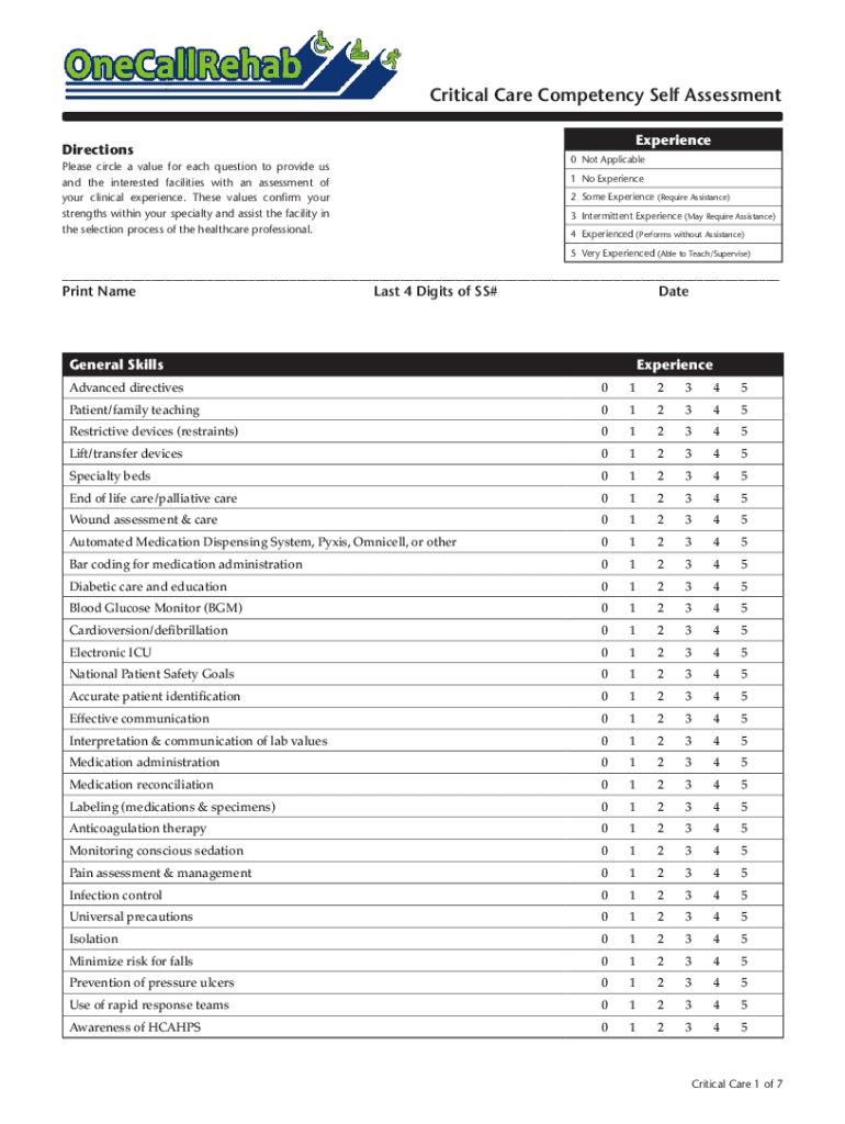 Critical Care Competency Self Assessment Directions Please circle a value for each question to provide us and the interested facilities with an assessment of your clinical experience. These values