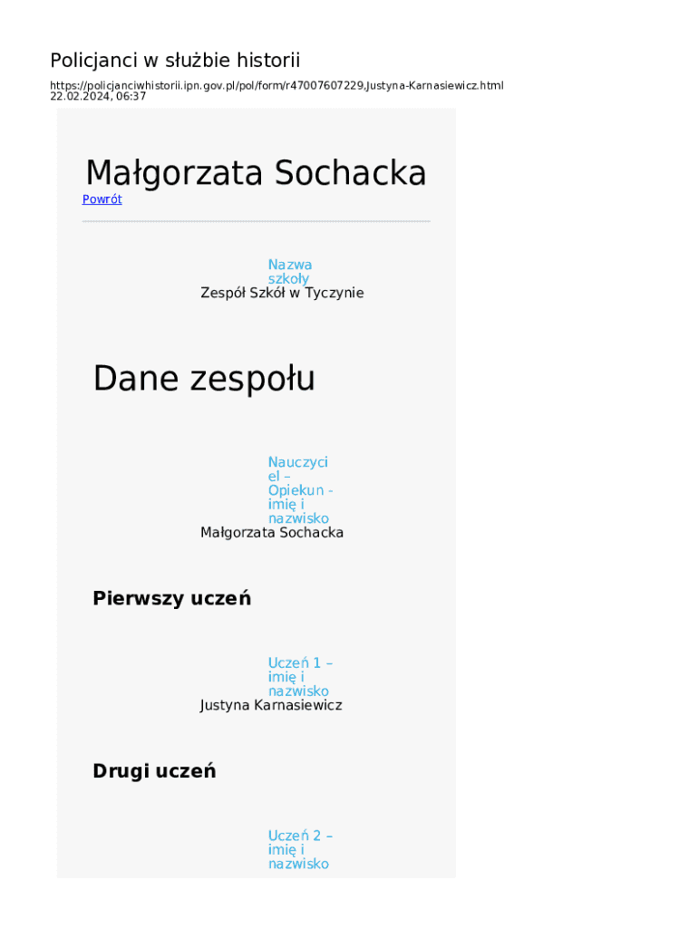 Policjanci w subie historii https://policjanciwhistorii.ipn.gov.pl/pol/form/r47007607229,JustynaKarnasiewicz.html 22.02.2024, 06:37Magorzata SochackaPowrtNazwa szkoy Zesp Szk w TyczynieDane zespou
