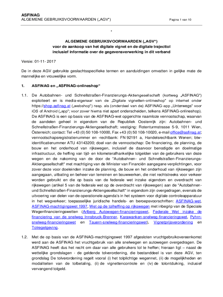 ASFINAG ALGEMENE GEBRUIKSVOORWAARDEN (AGV)Pagina 1 van 10* ALGEMENE GEBRUIKSVOORWAARDEN (AGV) voor de aankoop van het digitale vignet en de digitale trajecttol inclusief informatie over de gegevensverwerking