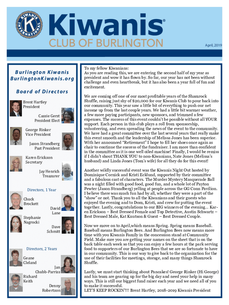 April, 2019B u r l i n g t o n K i wa n i s B u r l i n g t o n K i wa n i s . o r g Board of Directors Brent Hartley PresidentCassie Gerst President ElectGeorge Rinker Vice PresidentJason Strandberg