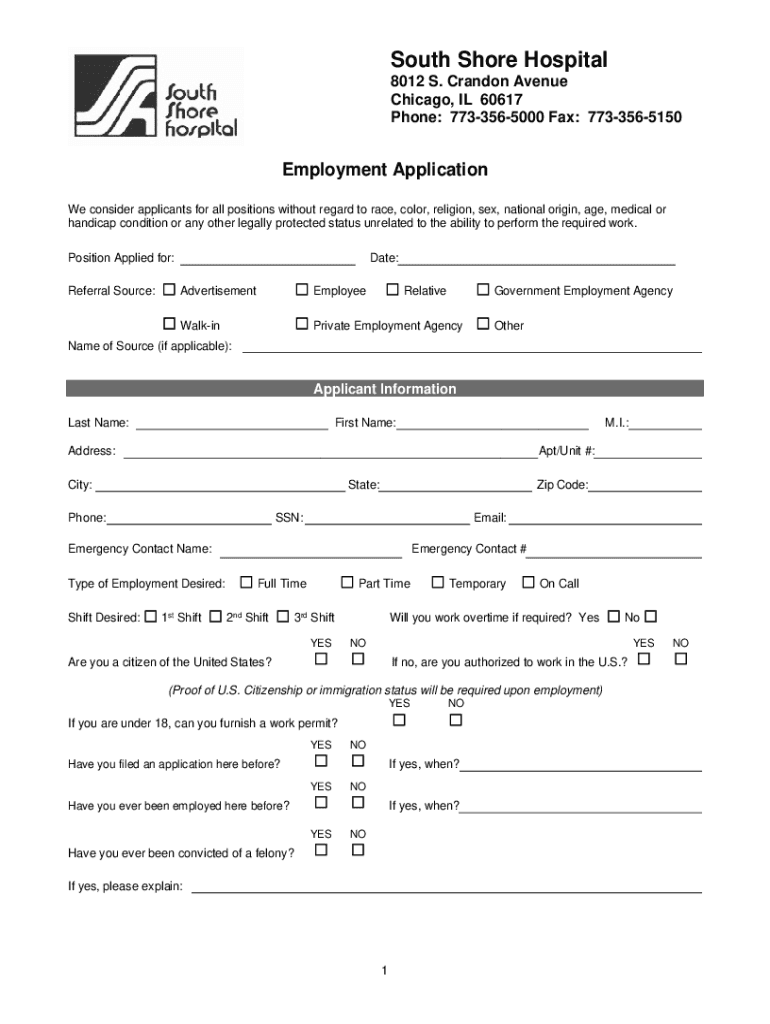 South Shore Hospital 8012 S. Crandon Avenue Chicago, IL 60617 Phone: 7733565000 Fax: 7733565150Employment Application We consider applicants for all positions without regard to race, color, religion,