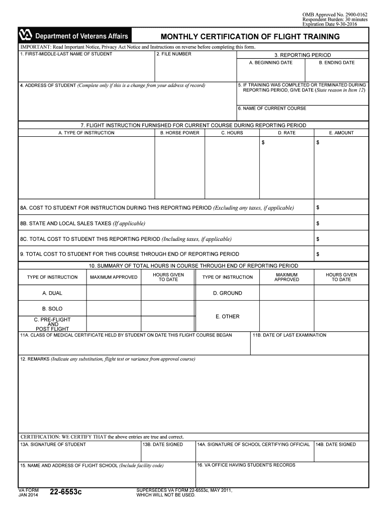 OMB Approved No. 2900-0162 Respondent Burden: 30 minutes Expiration Date 9-30-2016 MONTHLY CERTIFICATION OF FLIGHT TRAINING IMPORTANT: Read Important Notice, Privacy Act Notice and Instructions on