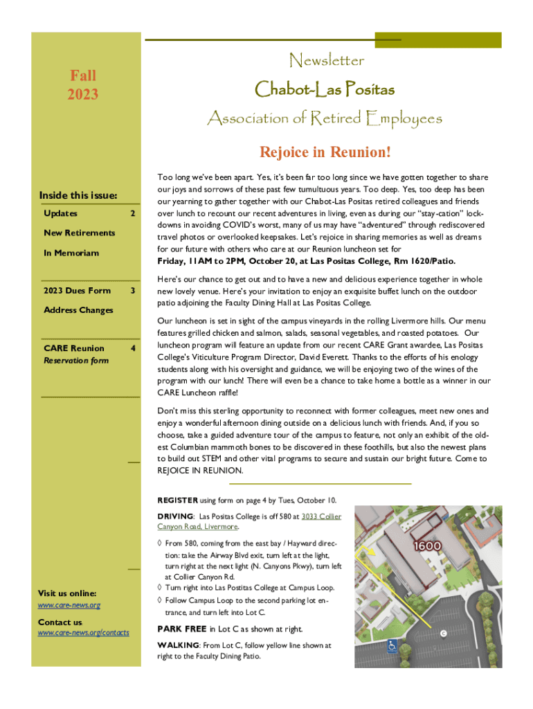 NewsletterFall 2023ChabotLas Positas Association of Retired Employees Rejoice in Reunion!Inside this issue: Updates2New Retirements In Memoriam2023 Dues Form3Address ChangesCARE Reunion Reservation