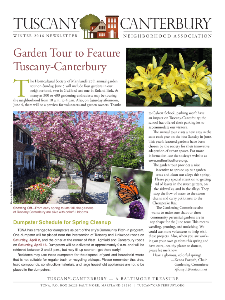 TUSCANYCANTERBURYWINTER 2016 NEWSLETTER E I G H B O R H O O D A S S O C I AT I ON Garden Tour to Feature