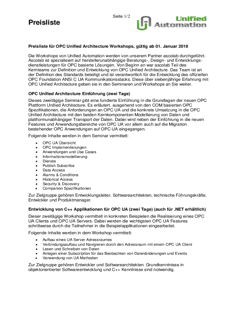Seite 1/2PreislistePreisliste fr OPC Unified Architecture Workshops, gltig ab 01. Januar 2019 Die Workshops von Unified Automation werden von unserem Partner ascolab durchgefhrt. Ascolab ist spezialisiert