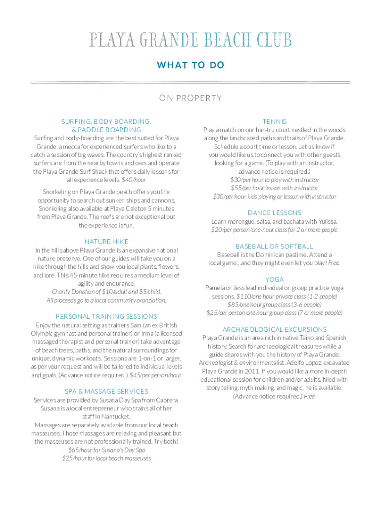 W H AT T O D OON P RO P E RT Y SURFING, BODY BOARDING, & PADDLE BOARDING Surfing and bodyboarding are the best suited for Playa Grande, a mecca for experienced surfers who like to a catch a session