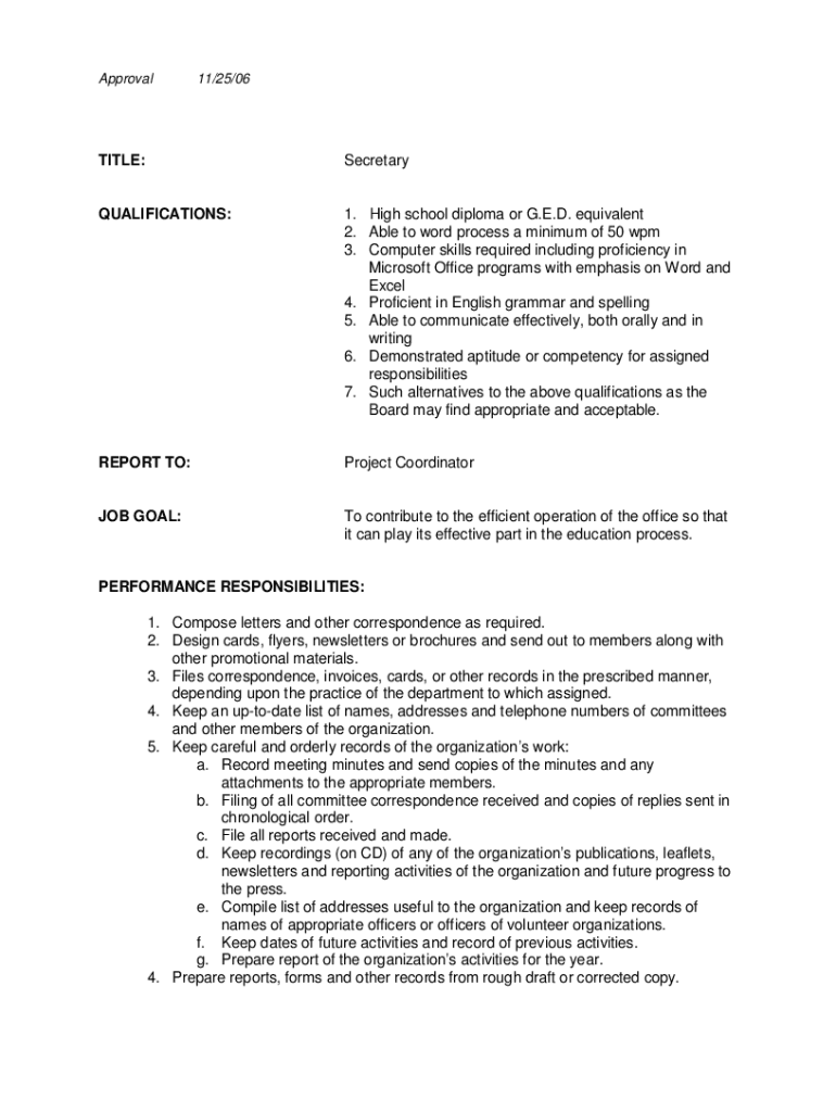 Approval11/25/06TITLE:SecretaryQUALIFICATIONS:1. High school diploma or G.E.D. equivalent 2. Able to word process a minimum of 50 wpm 3. Computer skills required including proficiency in Microsoft