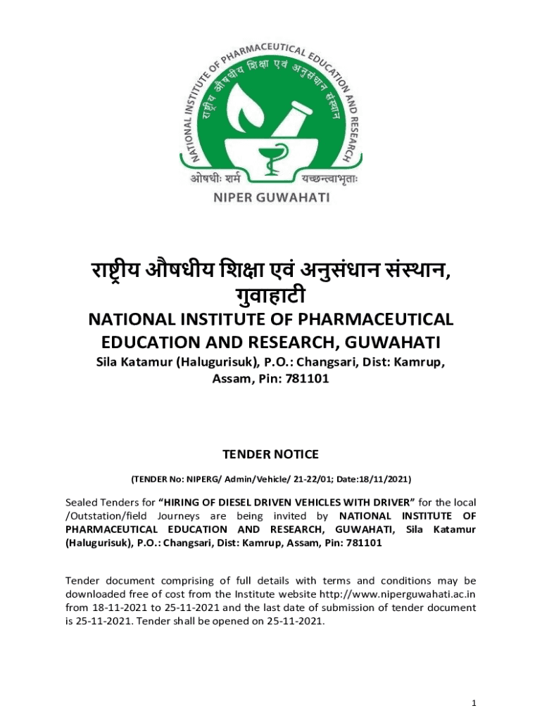 , NATIONAL INSTITUTE OF PHARMACEUTICAL EDUCATION AND RESEARCH, GUWAHATI Sila Katamur (Halugurisuk), P.O.: Changsari, Dist: Kamrup, Assam, Pin: 781101TENDER NOTICE (TENDER No: NIPERG/ Admin/Vehicle/