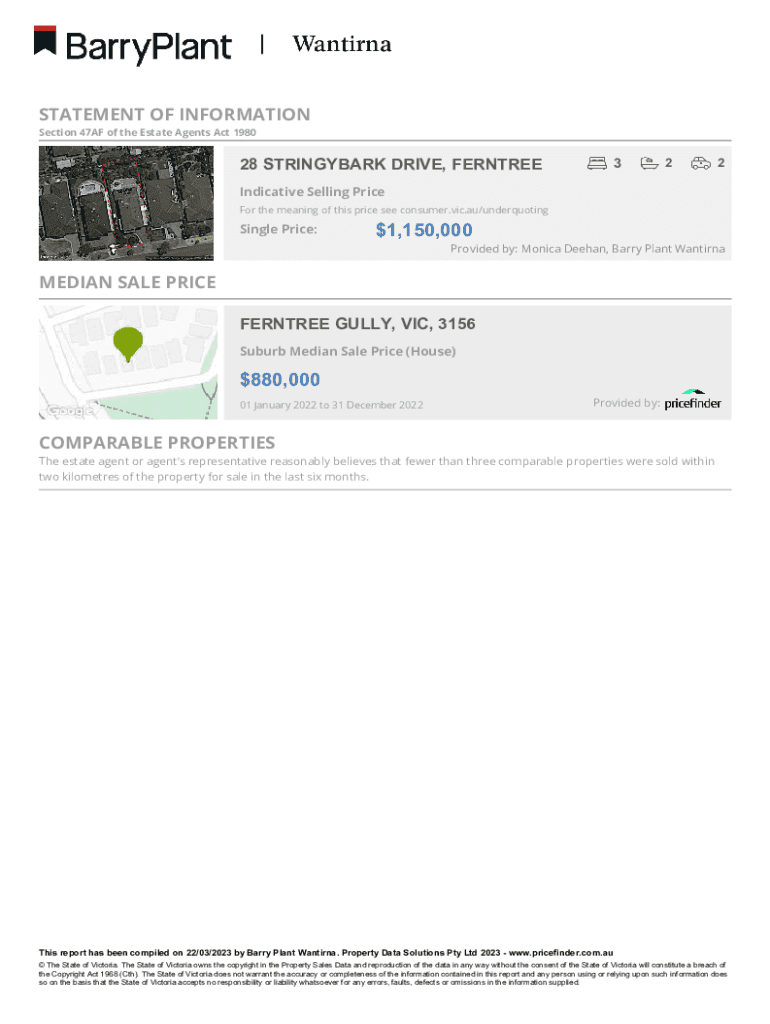 STATEMENT OF INFORMATION Section 47AF of the Estate Agents Act 1980328 STRINGYBARK DRIVE, FERNTREE22Indicative Selling Price For the meaning of this price see consumer.vic.au/underquotingSingle Price:$1,150,000