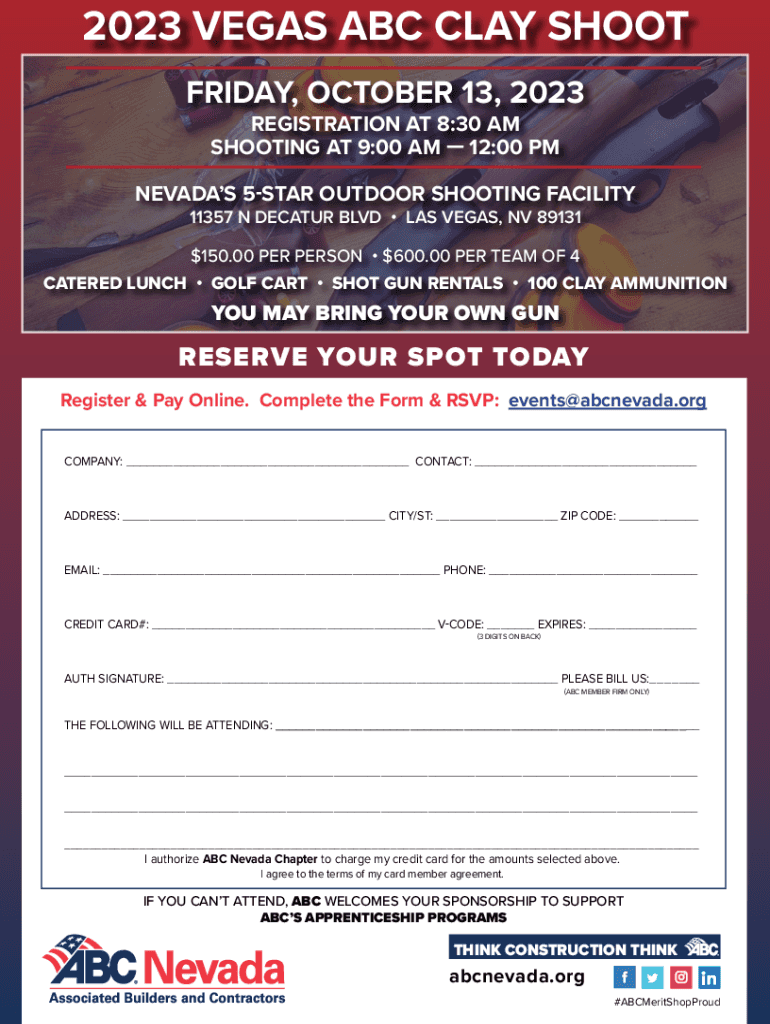 2023 VEGAS ABC CLAY SHOOT FRIDAY, OCTOBER 13, 2023 REGISTRATION AT 8:30 AM SHOOTING AT 9:00 AM 12:00 PMNEVADAS 5STAR OUTDOOR SHOOTING FACILITY 11357 N DECATUR BLVD LAS VEGAS, NV 89131$150.00 PER PERSON